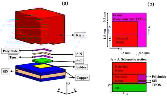 The multilaminar assembly considered in this study consists of different material layers, all of which present different mechanical and thermal properties. The chosen configuration (Figure 1a) is made of a copper-ceramic-copper Active Metal Brazed (AMB) substrate in which a silicon nitride layer (Si3N4 or SiN briefly) is bonded to two copper layers, solder layer (PbSnAg) that electrically connects the top copper layer of the AMB substrate with the upper SiC layer, a double passivation layers formed by TEOS (tetraethyl orthosilicate) and SiN deposited onto the SiC upper surface, a layer of polyimide accommodating for the thermomechanical solicitations [], and finally a thermosetting resin that encapsulates the whole multilaminar package. Slightly different configurations of the targeted components can be found in []. The passivant layers, as TEOS, SiN, and polyimide layers, present a frame shape as shown in Figure 1b. During the manufacturing process, the inner empty space inside the three aforementioned layers is filled with resin, indicated as internal resin in Figure 1b.