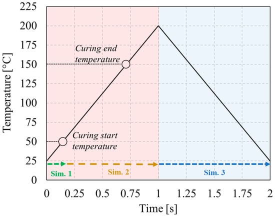 The manufacturing stages prior to the resin molding are assumed to be complete, so the AMB substrate supporting the soldered SiC die, and the three passivants of TEOS, Si3N4, and polyimide are considered to be already a single semi-finished multi-layered body. This partially assembled structure is also named “Copper-to-Poly” assembly for brevity. In the molding process here considered, the resin is firstly preheated up to a representative temperature of 50 °C to flow into the mold. The preheated resin, in the state of a viscous fluid, is pressurized into the mold where it fills all the space and is pushed against its mating surfaces, namely the upper copper layer of the AMB substrate, the SiC on top of it, and the polyimide. The viscous resin starts to adhere to the above surfaces while it is still fluid and has negligible stiffness/elastic modulus. As the mold is full and pressurized, the temperature gradually increases up to 200 °C. Slightly above the 150 °C temperature of complete curing of the resin. A final cooling phase from 200 °C to 25 °C follows. Figure 2 shows the considered temperature cycle vs. time (the time scale is arbitrary as no rate–effect are modeled). The simulation strategy (see arrows in Figure 2) will be further clarified in the next section. During the heating phase, the whole assembly goes through thermomechanical loadings of two interacting types.