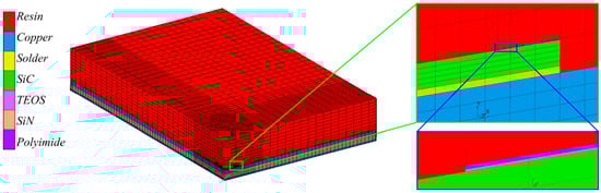 Numerical simulations of the resin molding process are performed by the commercial FE code MSC Marc®. Only a quarter of the assembly is modeled thanks to the symmetries. A schematic representation of the meshed assembly is given in Figure 3. The resin volume above the polyimide layer (External Resin in Figure 1b), the AMB substrate, and SiC are modeled using full integration eight-node, isoparametric, hexahedral solid elements (SE) (Hex 7 in Marc), while solder, passivants (TEOS, SiN, and polyimide), and internal resin are modeled using solid shell elements (SSE) having eight-node brick topology and shell formulation (Hex 185 in Marc). This modeling choice allows a better definition of the contact between the different layers as well as a better discretization of the resin mesh. The mathematical formulation of the solid shell element includes integration points through the element thickness in order to capture the material response under bending load. This element definition is particularly suitable in the case of solids in which the in-plane dimensions are much greater compared to the through thickness one, but planar quad-elements are not accurate enough or do not allow dual-face contact interactions.