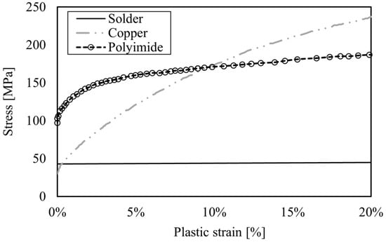 The temperature history given in Figure 2 is uniformly imposed all over the entire model. All materials are modeled as purely elastic bodies according to the data reported in the literature [,,,,,], with the exception of copper, solder, and polyimide, which are considered to be elastoplastic according to the representative hardening curves shown in Figure 4. For the latter elastoplastic materials, the adopted model is the classic Von Mises plasticity combined with isotropic hardening. Considering the plasticity of the materials involved is a key innovative aspect of the present work, as it is commonly completely neglected in the literature. Elastic constants, mass density, and coefficient of thermal expansion for all materials, considered at room temperature, are listed in Table 2. These characteristics are assumed temperature-independent, as commonly performeddone in the literature []. However, this approximation may affect the results, but it does not compromise the innovativeness of the proposed approach, as discussed below. Note that each material in the package exhibits a different coefficient of thermal expansion (see Table 2). Namely, each material will tend to deform differently during heating. As well documented in the literature [,], such mismatch can generate shear stresses, promote delamination, and ultimately lead to failure.
