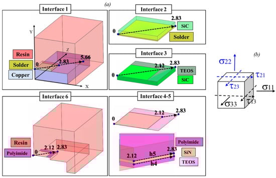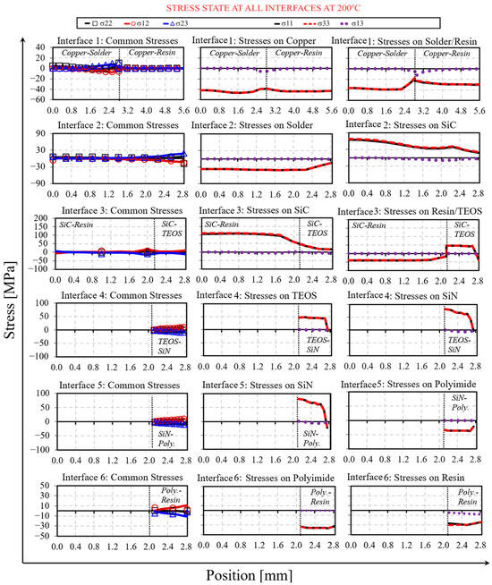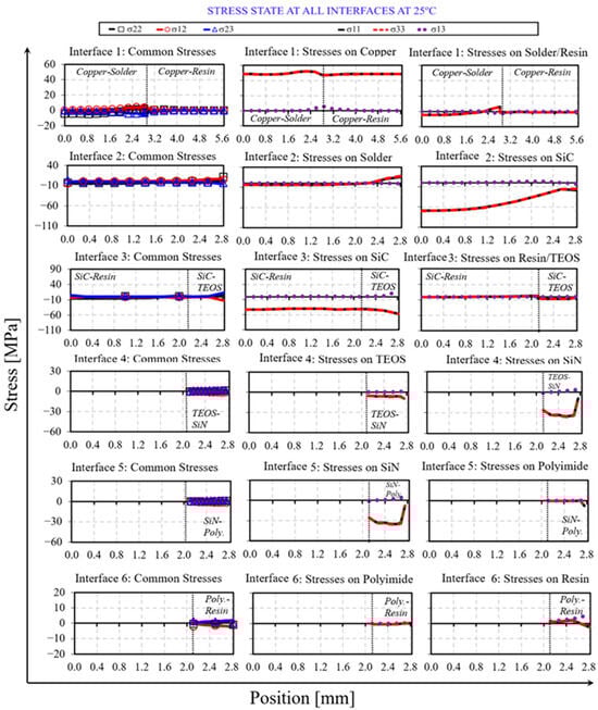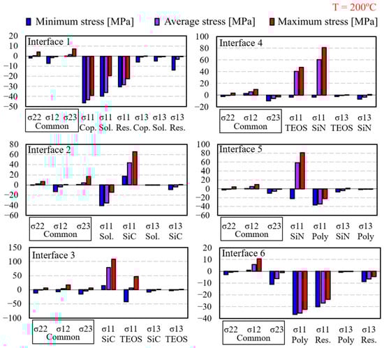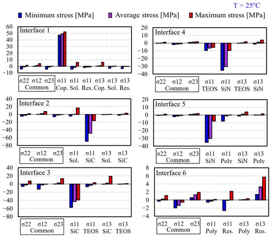 Figure 9 shows all the stress components along all paths at each single interface (see also Figure 6) at the end of cooling, T = 25 °C. Additionally, for better readability, maximum, average, and minimum stresses for each interface are summarized in Figure 10.