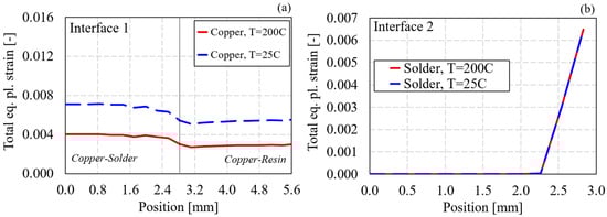 As previously mentioned, the molding process also results in the accumulation of plastic deformation in the material layers where plasticity is considered. Figure 11 shows the accumulated plastic deformation at 200 and 25 °C at Interface 1 (copper–solder), Interface 2 (solder-SiC). In particular, in Figure 11a, the equivalent accumulated plastic strain is considered in the nodes belonging to copper. The equivalent plastic strain accumulated at the solder nodes was negligible.
