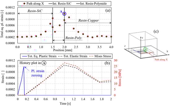 (a) Total equivalent plastic strain along x at the interfaces resin–SiC, resin–polyimide, and resin–copper before zeroing of plastic strain (T = 49 °C). (b) History plot of total equivalent plastic strain, total elastic strain, and Mises stress at the resin location (A) of maximum plastic deformation before zeroing of the plastic strain. (c) Scheme of the assembly and identification of the analyzed resin location.