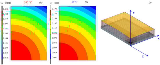 Reliability studies on power electronic components usually include the assessment of the package warpage, namely, the out-of-plane displacement of the component, under different thermomechanical gradients reproducing the working conditions. The ideal condition of zero warpage corresponds to perfectly flat package, meaning that all components do not present any shape variations after the application of the thermomechanical cycles, either due to the technological processes for their production, to the passive cycles imposed for their qualification, or to the active cycling of their operational life. However, experimental work and numerical simulations [,,] put into evidence that thermomechanical loads in all the above conditions often result in the component warpage. This phenomenon must be mitigated since it can result in imperfect connection between different layers during the package assembling or in the degradation and anticipated failure of the electrical and thermal performance of the component during its operational life. The warpage of the targeted component is discussed here, analyzing the out-of-plane displacement at the top side of the resin at the peak temperature of 200 °C as well as at 25 °C after the resin molding procedure is completed. Figure 13 shows that the solidification process can result in a remarkable warpage at the top surface of the resin capsule.