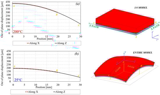 The warpage of the device is further discussed by analyzing the distributions of out-plane displacement along two paths, respectively, parallel to the x-axis and the z-axis, both passing by the center of the assembly plan view, at the mid-plane level of the AMB (see Figure 14). Interestingly, at both 200 °C and at 25 °C, the out-of-plane displacement along both paths follows the same trend, suggesting an almost symmetrical deformation. This result further indicates a cry-type shape after the manufacturing step of resin molding, provided that in this work the AMB is assumed to be flat at the beginning of the resin molding.