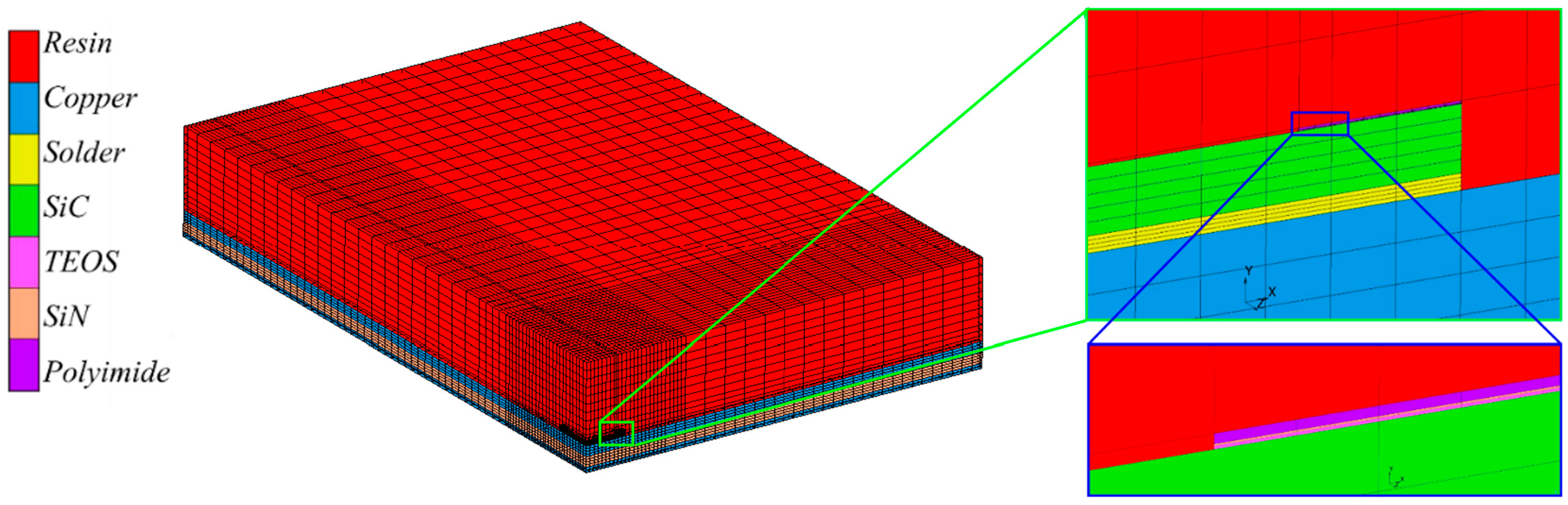 - Zhu, N.; Lee, S.Y.; van Wyk, J.D.; Odendaal, W.G.; Liang, Z.X. Thermal Stress and Intrinsic Residual Stress in Embedded Power Modules. In Proceedings of the 38th IAS Annual Meeting on Conference Record of the Industry Applications Conference, Salt Lake City, UT, USA, 12–16 October 2003; Volume 2, pp. 1244–1250. [Google Scholar]
