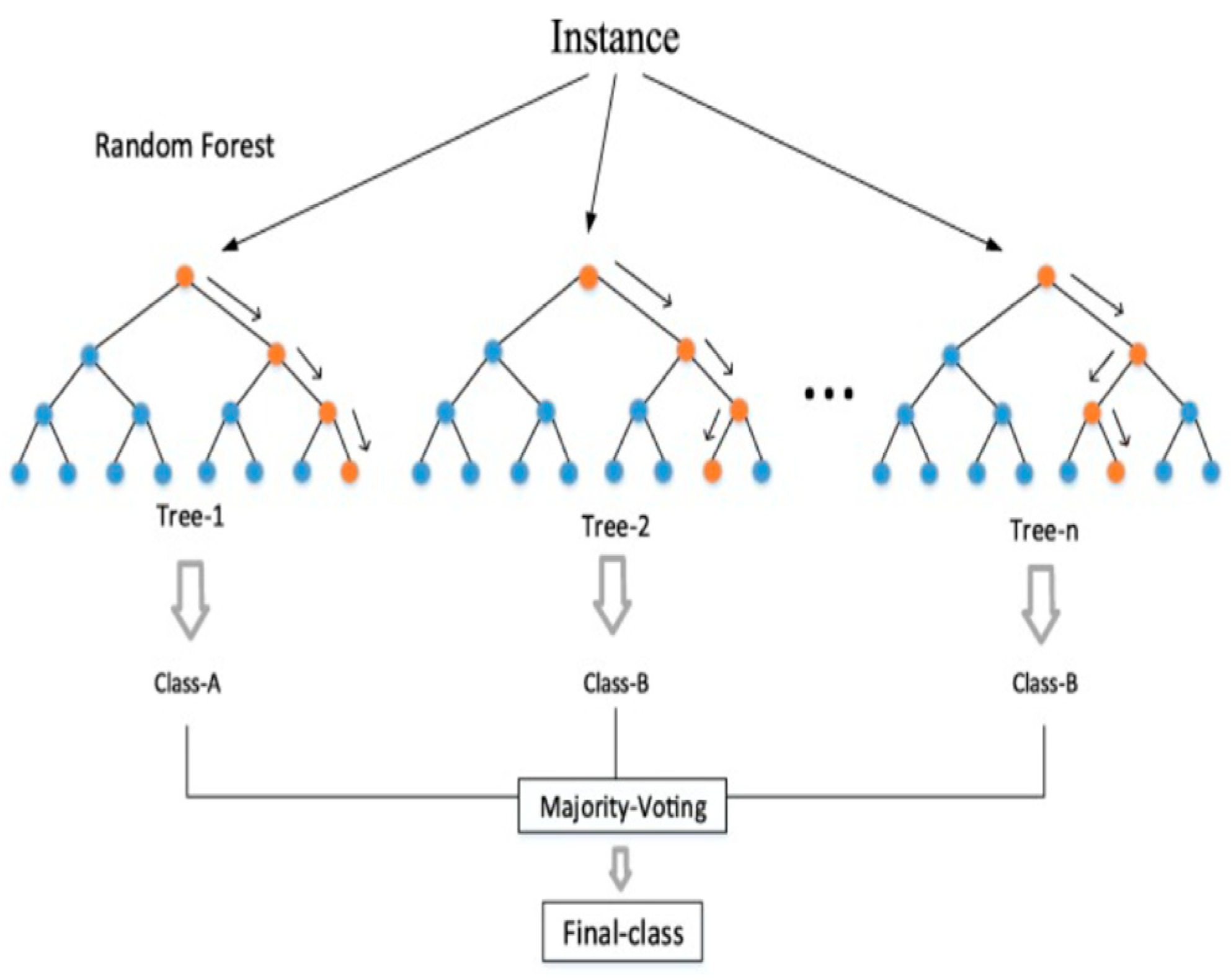 Figure 1, the induction of a decision tree is a recursive and greedy partitioning process of the feature space. This procedure iteratively partitions the training data into increasingly pure subsets, ultimately forming a tree structure. In the random forest framework, stochastic perturbations are introduced during the construction of each tree: at every node, rather than evaluating all features, the algorithm first samples a random subset of features and selects the optimal split solely from within this subset. This incorporation of stochasticity is essential for promoting diversity across the trees, preventing them from becoming highly correlated, and thereby establishing a foundation for effective ensemble aggregation. Tree growth initiates at the root node, which encompasses the entire bootstrap sample. For each node considered for splitting, the algorithm evaluates all features in the randomly sampled subset along with their candidate thresholds, assessing each potential split using a predefined impurity criterion to measure its quality. The goal is to select the split that achieves the greatest reduction in impurity in the resulting child nodes, thereby maximizing class homogeneity or value similarity within the subsets. This locally optimal, greedy strategy is applied recursively, expanding the tree in a top-down manner.