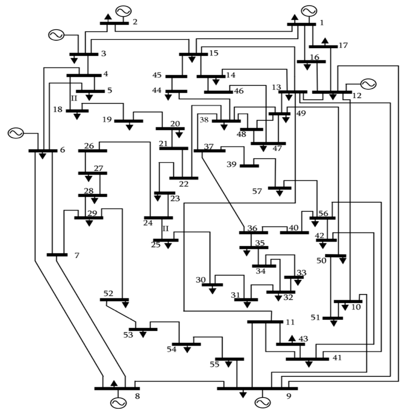 Figure 3, the system consists of 57 buses, 7 generators, 80 transmission lines, and a total load of 1250.8 MW. The computational time of the method proposed in this paper is mainly consumed in the OPF solution for the dataset construction process. The OPF solution takes up more than 90% of the total computational time, while the training of the random forest model and the calculation of SHAP values together account for less than 10%. The OPF solutions for the fault scenarios are independent of each other, and the parallel computing framework can be utilized to distribute the OPF tasks to multiple CPU cores for simultaneous execution. This parallel computing approach can reduce the computational time of the proposed method when dealing with larger-scale actual power grids.