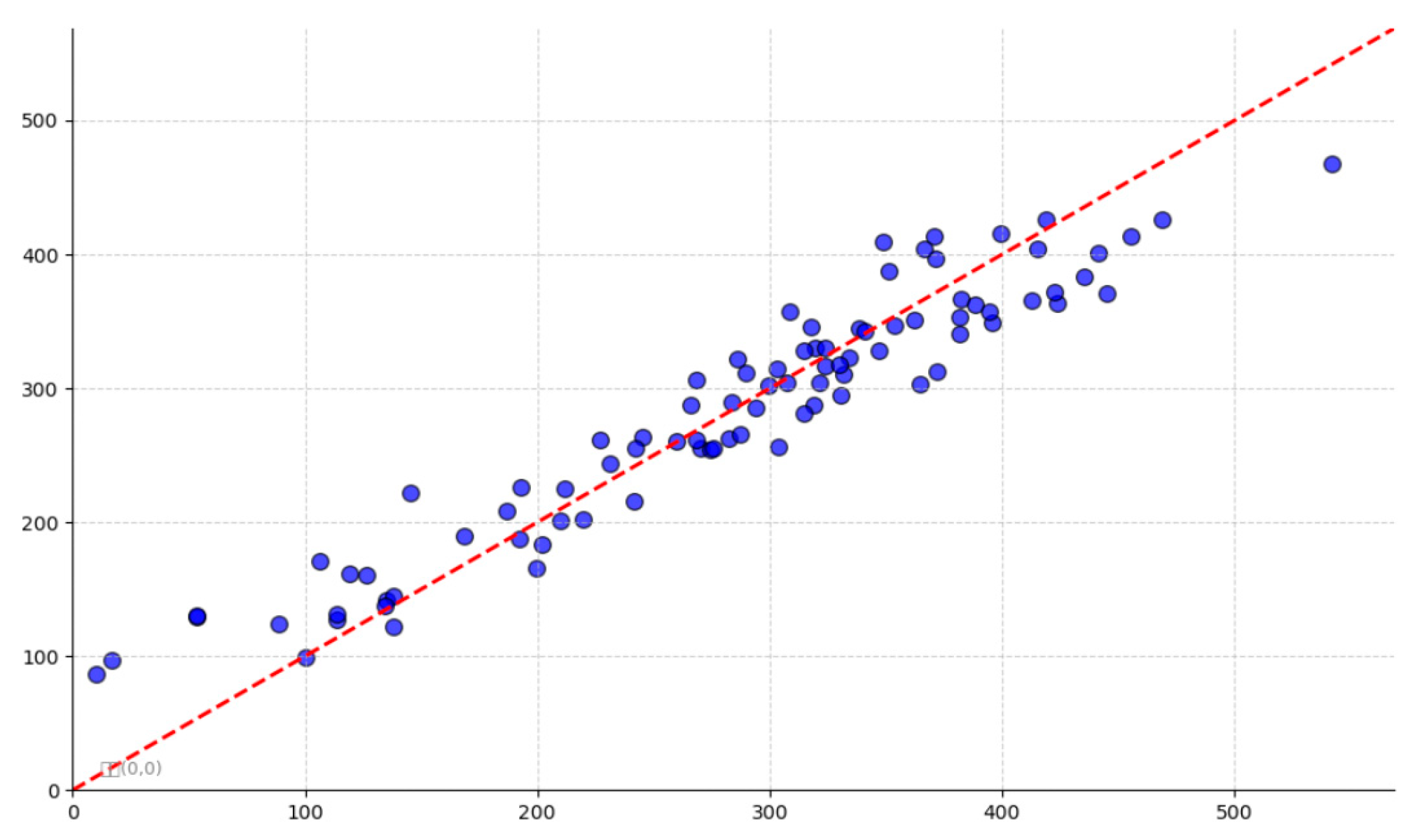 To ensure that the SHAP-based allocation of reliability responsibility is grounded in reliable predictions, this section evaluates the predictive performance of the random forest regression model. Because the model’s predictive accuracy directly determines the credibility of subsequent feature attribution analyses, multiple metrics are employed to validate performance from different perspectives. The metrics are computed as given in Equations (12)–(14).