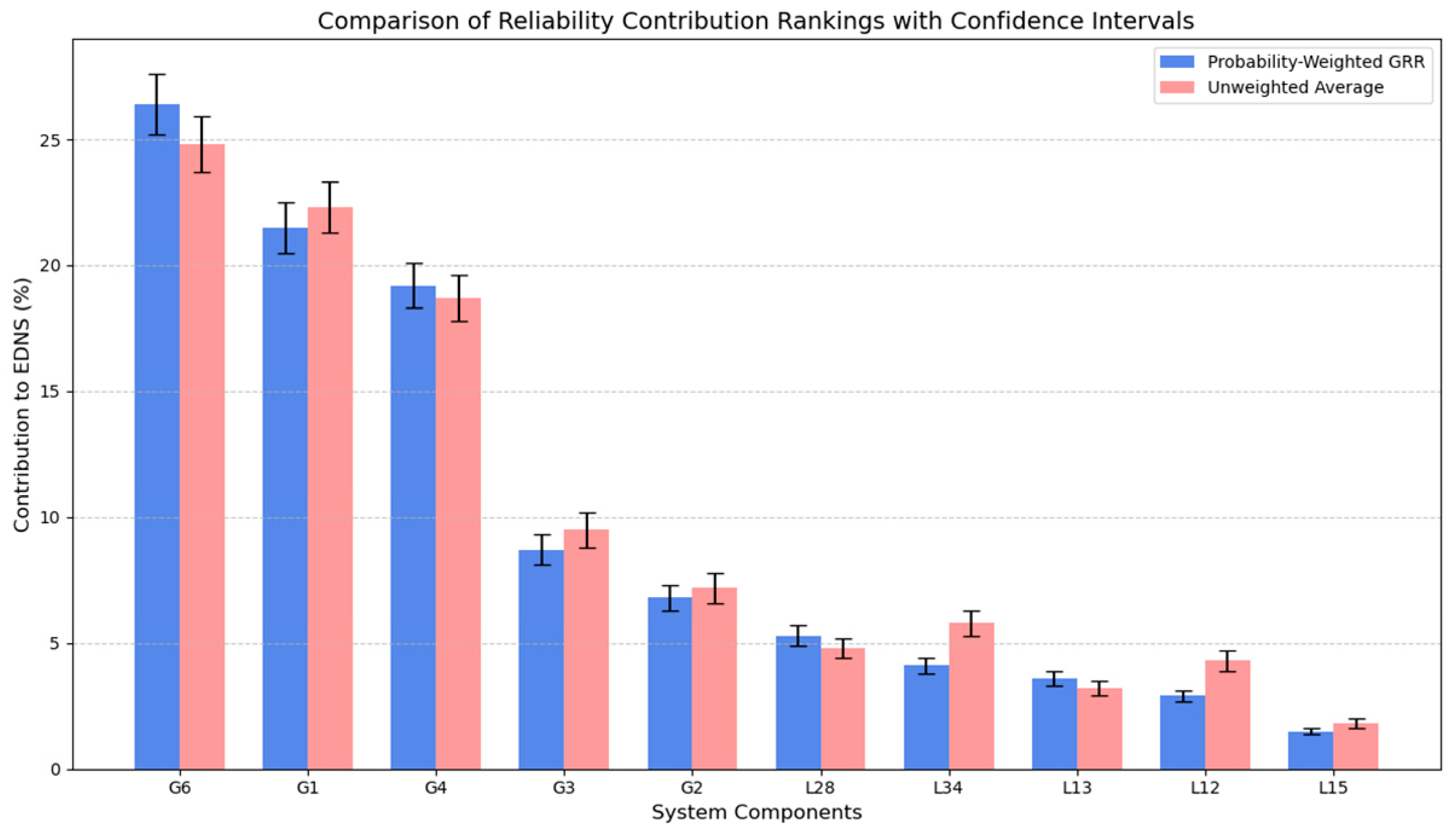 Figure 5, the probability-weighted GRR values are generally higher than the unweighted average, indicating that traditional unweighted methods may underestimate the actual reliability impact of critical components. Both methods yield consistent rankings for most components: G6, G1, and G4 consistently rank among the top three, suggesting that these generator components represent the most critical weak points in the system, and their identification remains unaffected by the weighting approach. Among the moderately impactful components, transmission line L34 shows a significant rise in the probability-weighted ranking, indicating that it contributes more substantially to system risk when fault probability is considered. These differences demonstrate that the probability-weighted method places greater emphasis on the actual risk contributions of components with high failure probabilities, whereas the unweighted method tends to average out the effects across different fault scenarios. The probability-weighted GRR approach maintains consistency with traditional methods while more effectively identifying components with both high probability and high impact, thereby providing more accurate decision-making support for system reliability optimization.