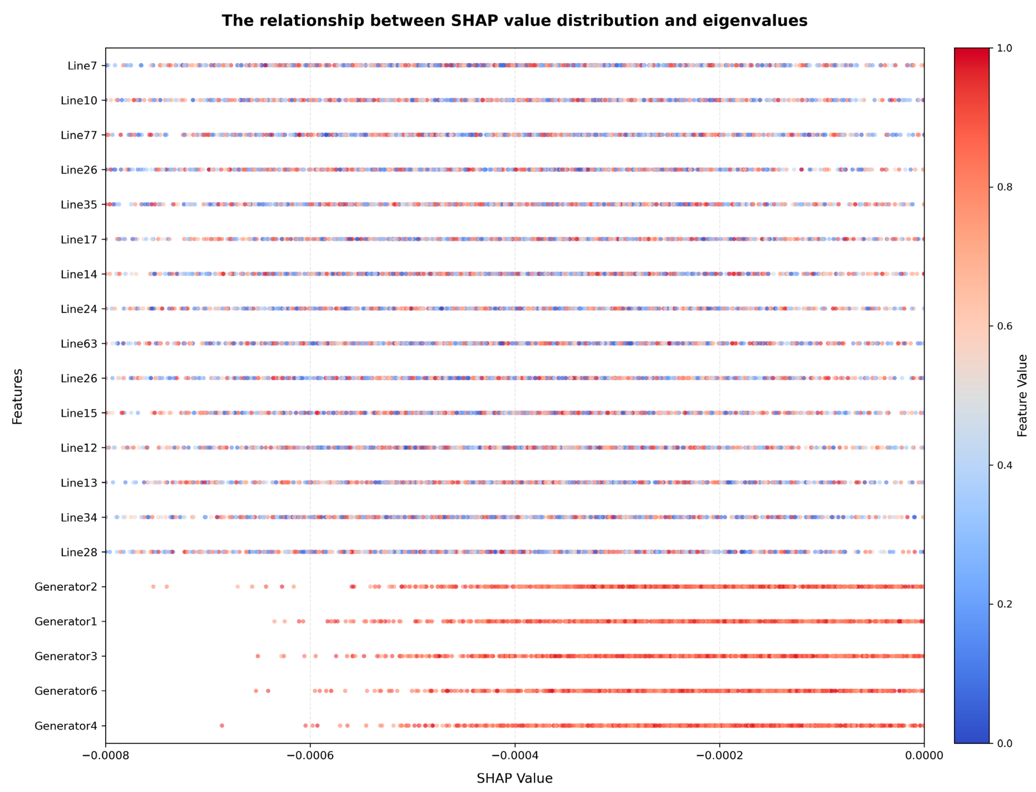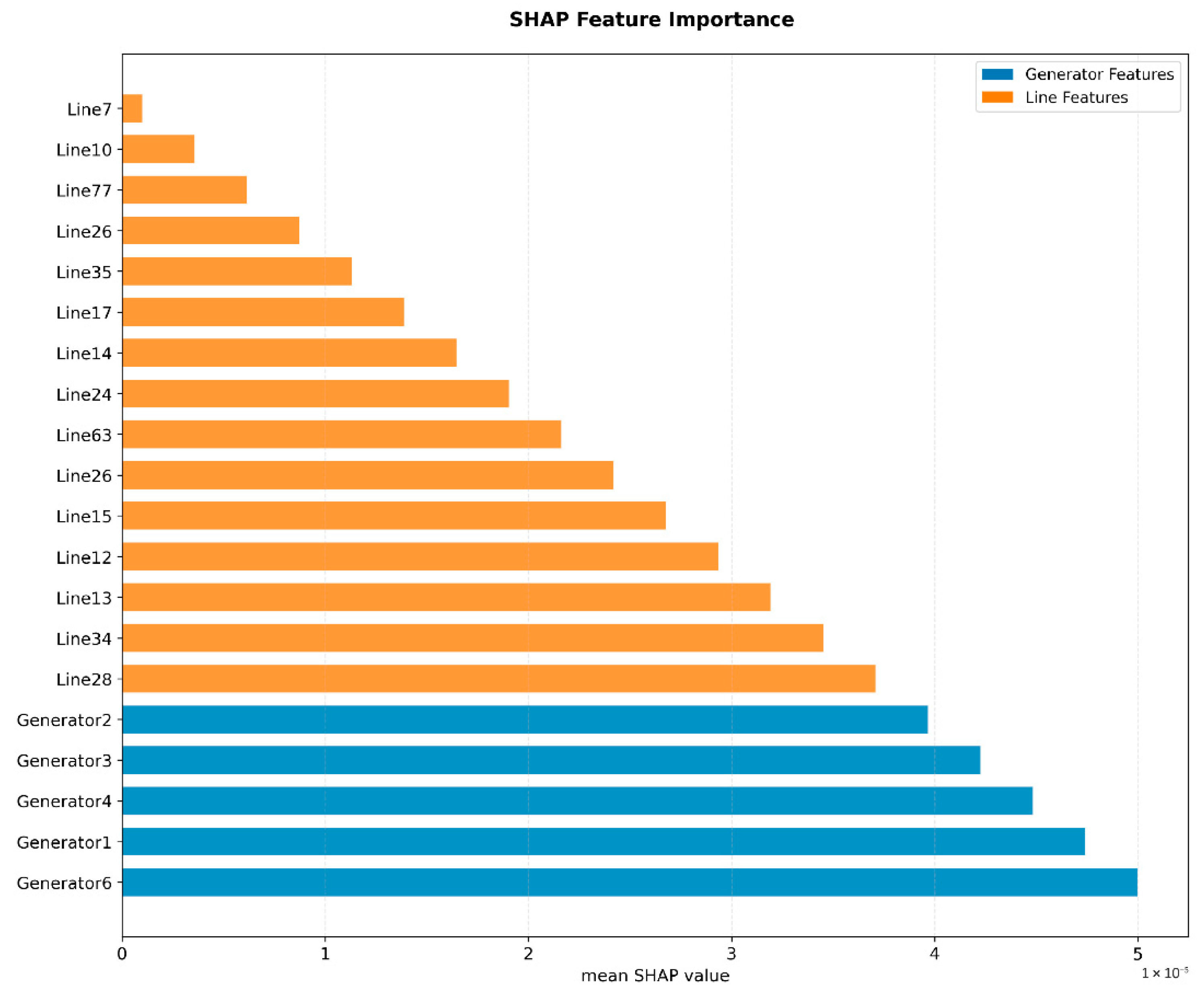 Among the transmission lines, a limited number of critical lines—such as Lines 28, 34, and 13—exhibit significantly higher SHAP values compared to others, underscoring their greater operational importance. The failure of any of these lines could directly lead to system splitting or result in the loss of power supply to major load centers. In contrast, the majority of transmission lines display SHAP values clustered within a lower range, indicating that the system retains a degree of redundancy and can generally withstand most single-line outages without provoking severe load-shedding events. This pronounced disparity in feature importance offers clear, data-supported justification for prioritizing the maintenance and monitoring of these critical lines.