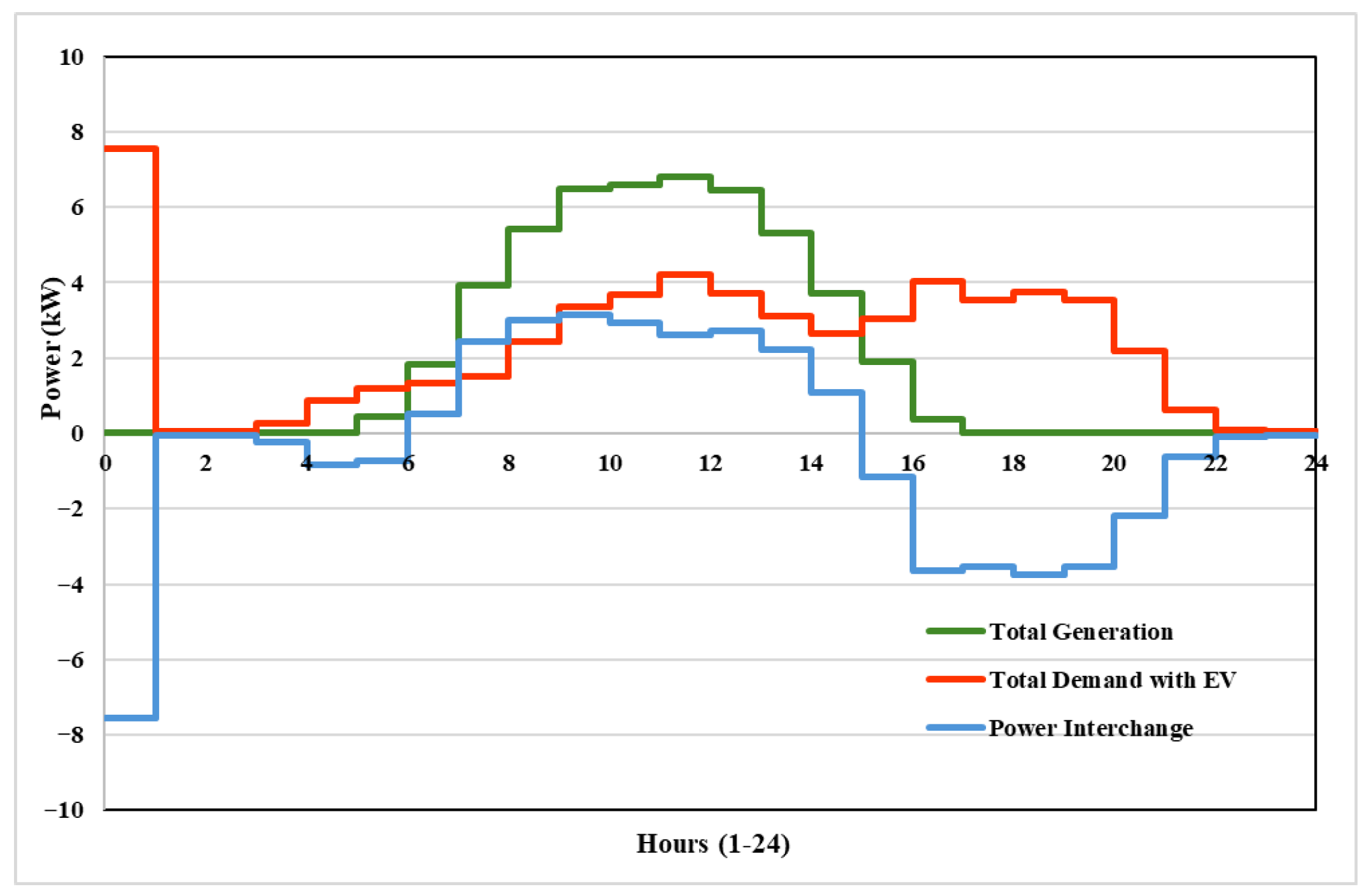 This study’s main goal is to reduce the cost of electricity. As a result, the optimization framework incorporates the previously described charging schedule. The baseline scenario, in which no optimization is used, shows the total power generation and consumption over 24 h intervals in
