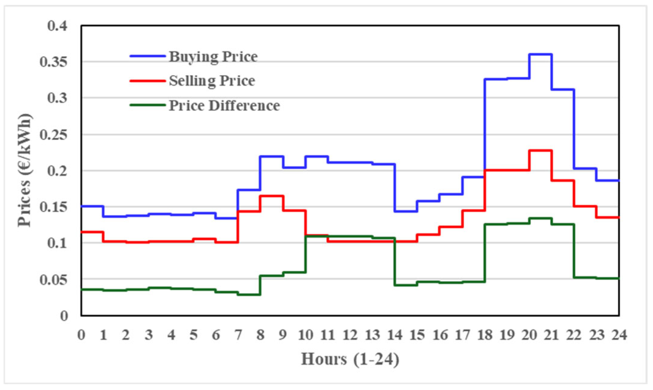 As previously stated, one of the main goals of the optimization process is to reduce electricity costs by planning EV charging for off-peak hours. The objective function must, therefore, be developed using electricity prices over a 24 h period. Different types of contracts control the price of power in the Spanish energy market. In contrast to variable-rate contracts, which have time-dependent tariffs that fluctuate hourly, fixed-rate contracts keep a constant price throughout the day, regardless of changes in demand. The current study focuses on a variable pricing system with the goal of lowering operating costs. Based on statistics from the Iberian energy market,
