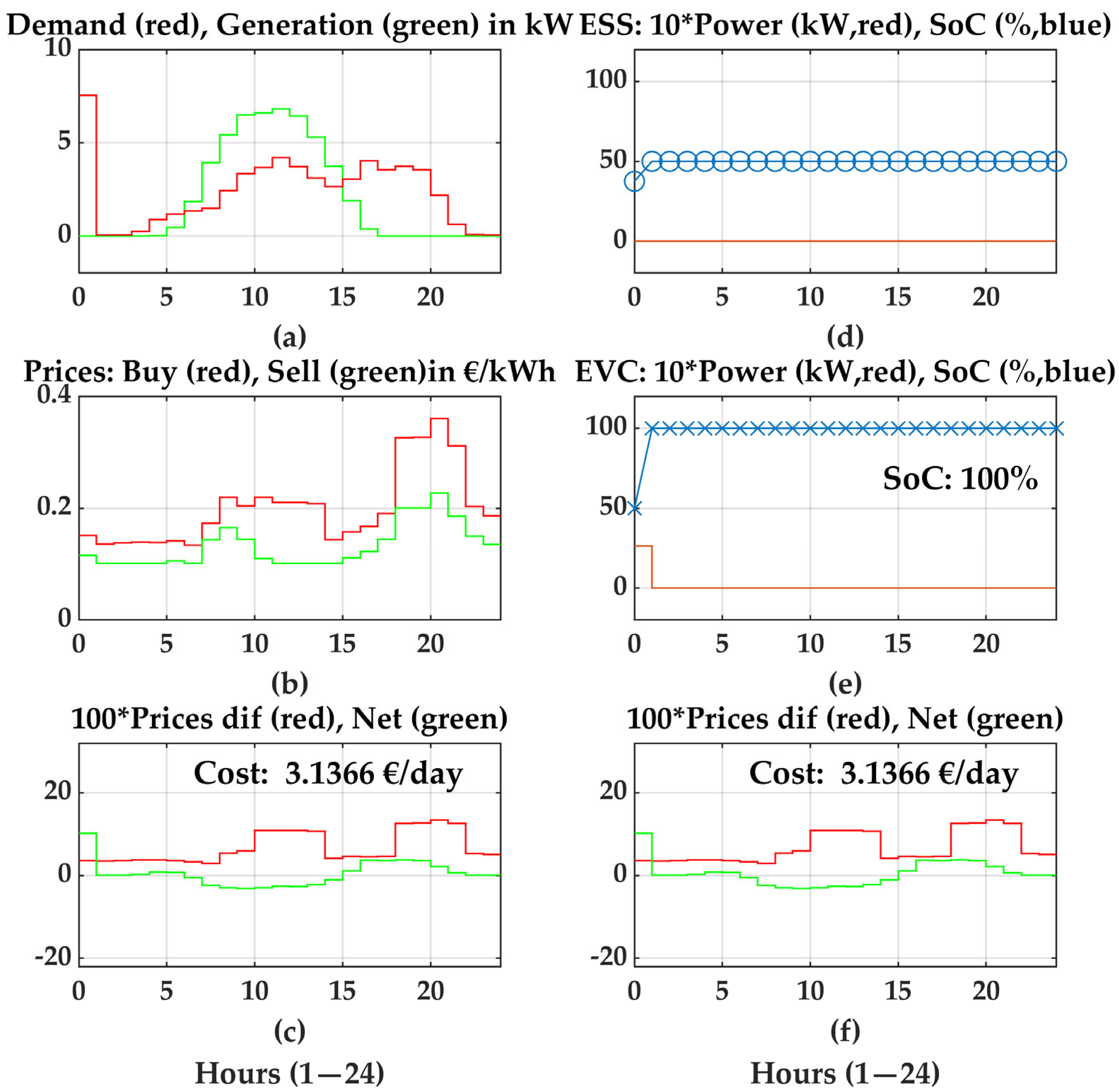 Figure 11 that after taking the references of operation of the ESS and EV from the optimal solution, the model behaves in an ideal way and the reference set-points are followed. The total cost of energy obtained in this way is 1.62 EUR/day, which deviates by only 3.85%.