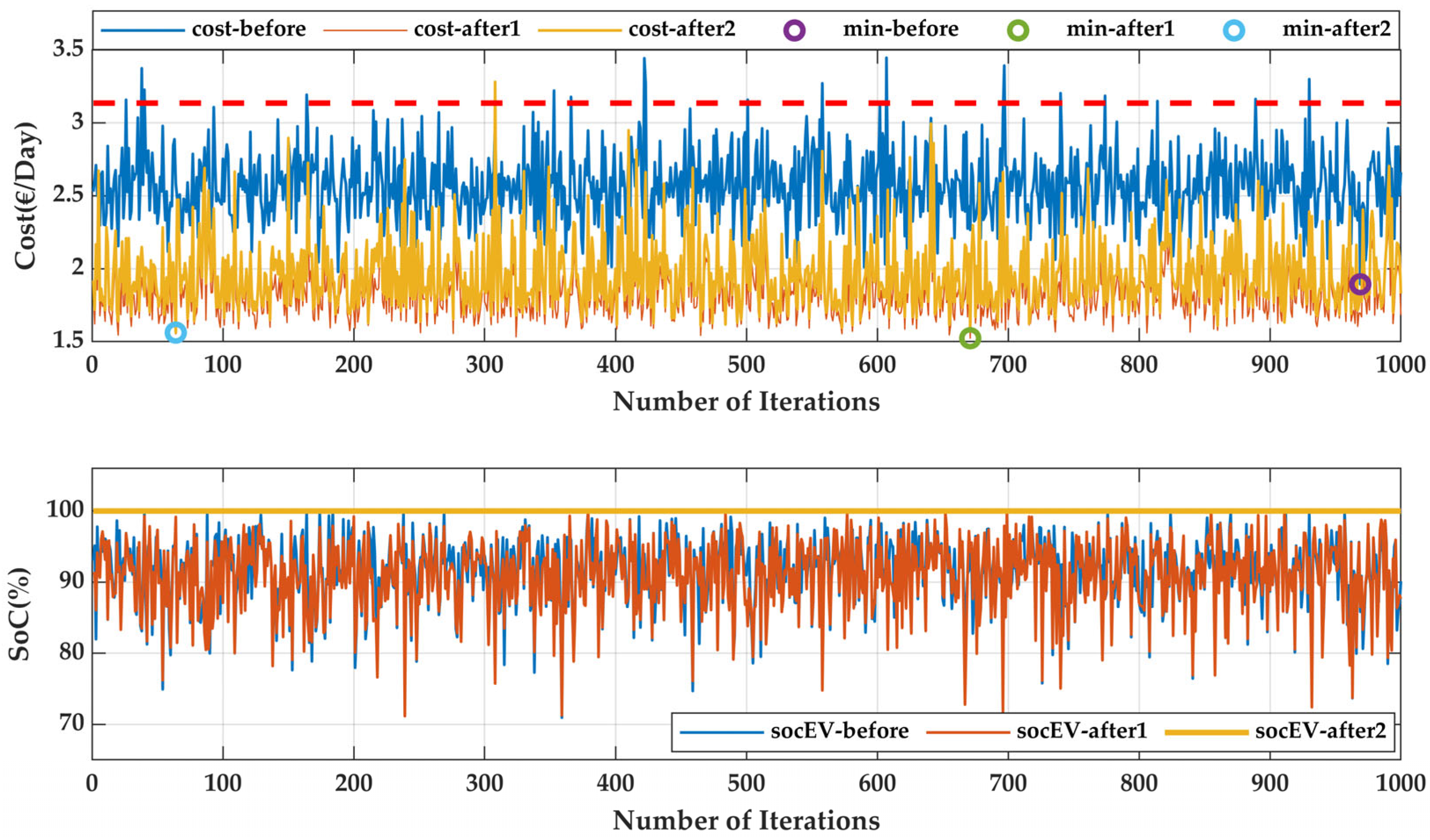 Figure 6. It can be concluded that after 1000 rounds, it is evident that the EV’s SoC limitation is not satisfied, not even once. Therefore, during the final hour of the EV’s charging time, the SoC must be adjusted. The primary significance of obtaining this result lies in the observation that although the lowest cost achieved through optimization occurs at the 969th iteration when only the GA is applied, this value decreases to the 671st iteration when the combined GA–F