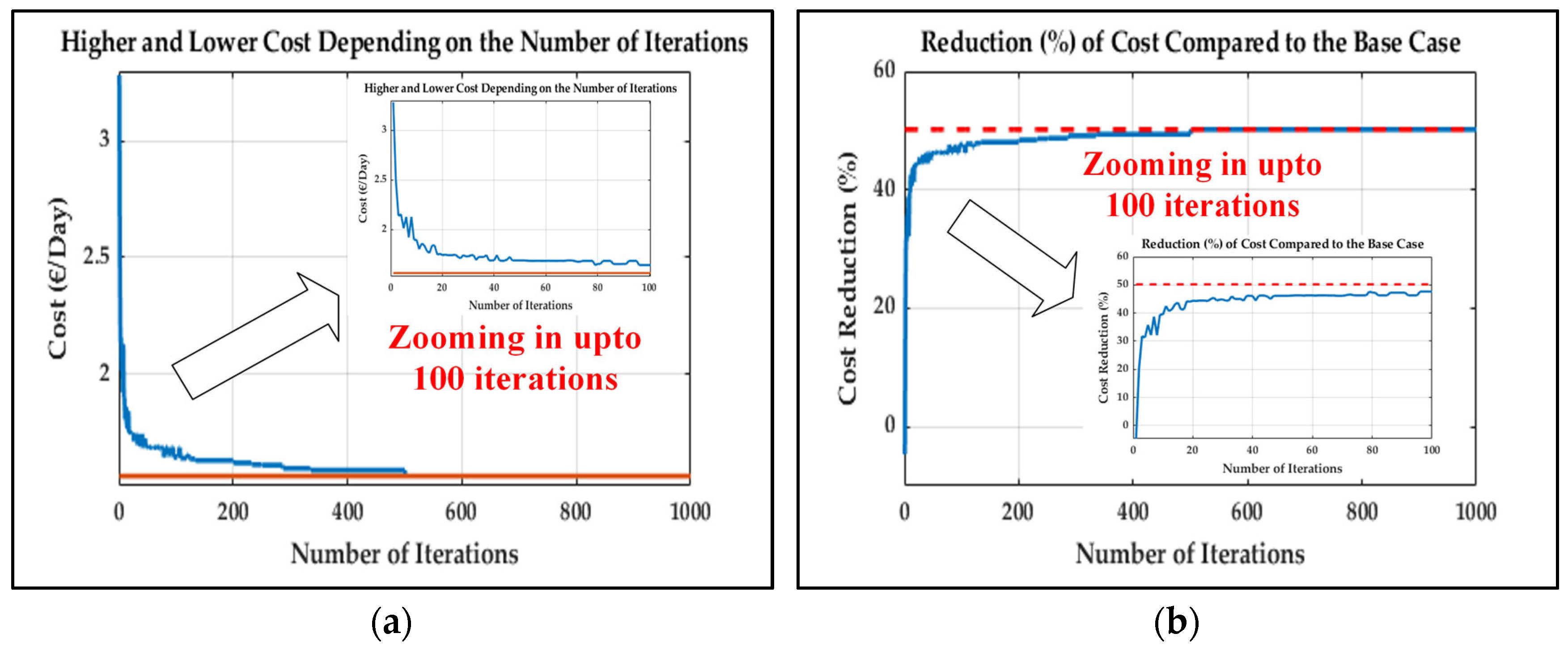 Figure 8b displays the reduction curve, which further supports the idea that costs decrease as the number of iterations increases by taking into account the cost reduction as a percentage.