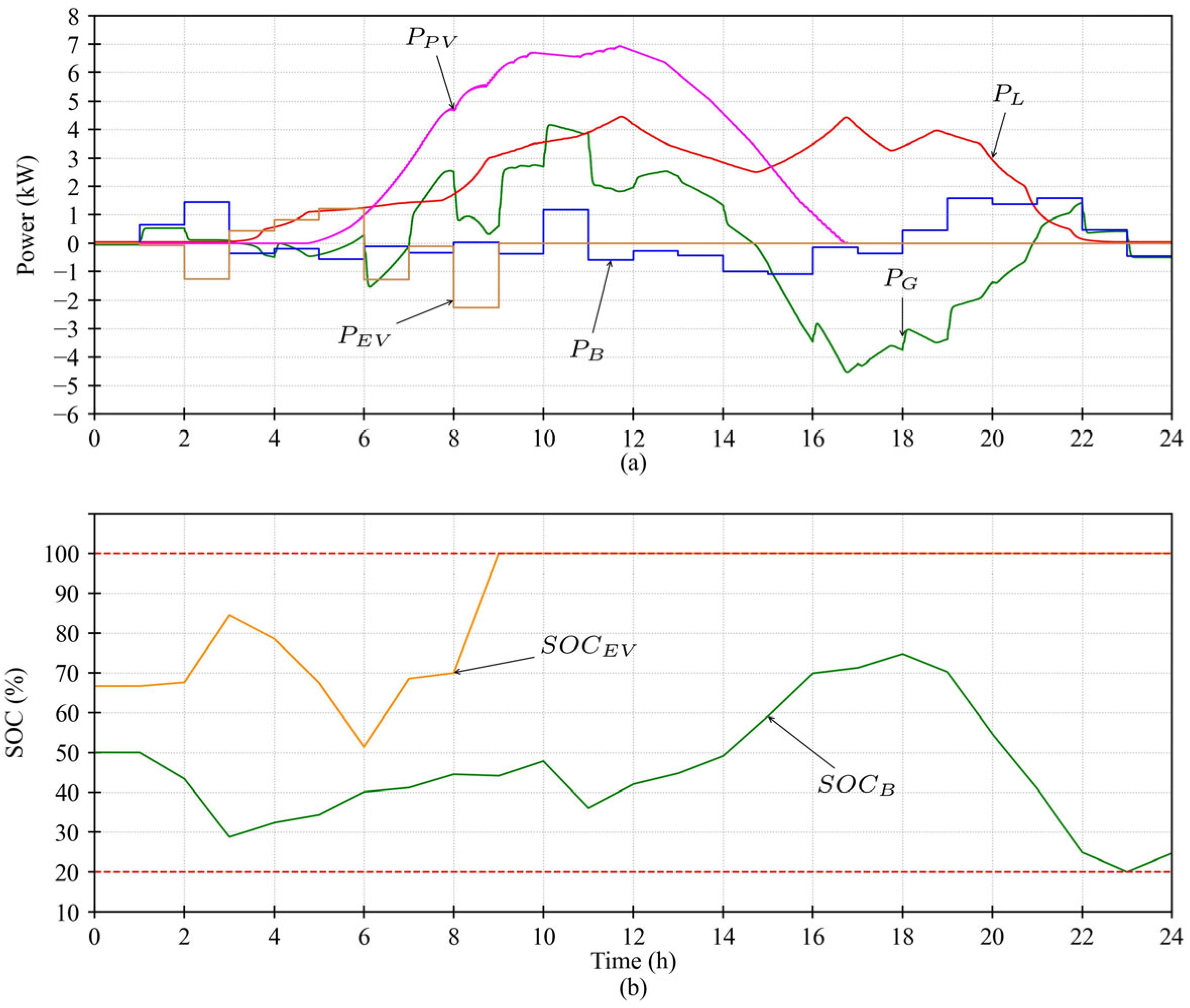 Here, the remaining power is provided from the grid to fully charge the EVs during the final hour (7 to 8 h) if their total SoC does not reach 7.5 kWh at the end of 8 h.