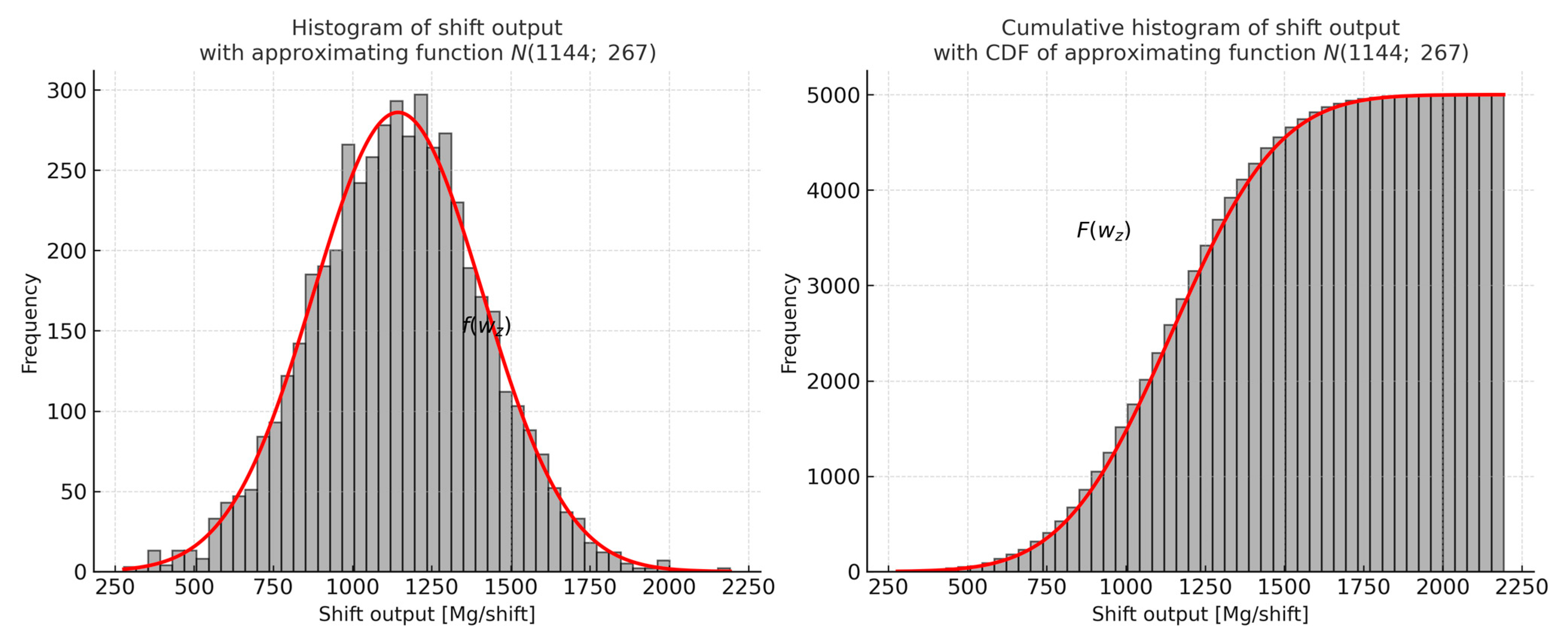 - Model 2: A normal distribution N(1144; 267) describes shift-based output. The cumulative probability corresponds to the median output Mg/shift.