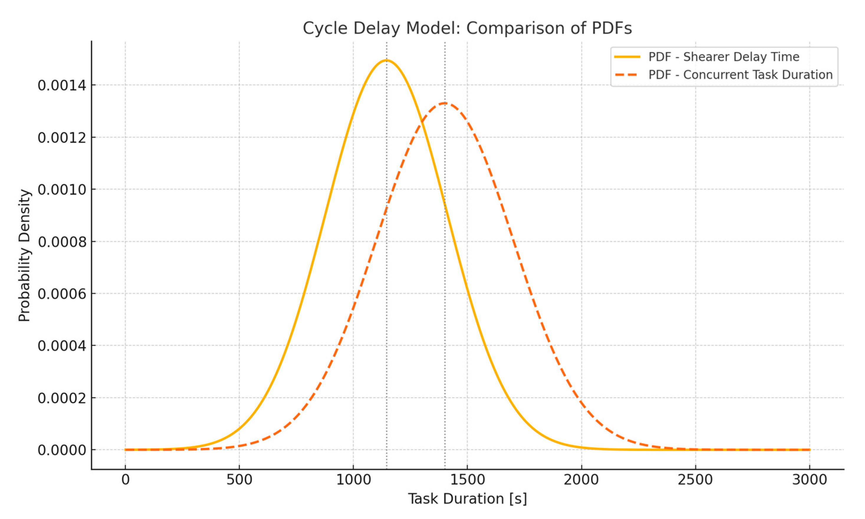 - Model 1: Evaluates delay probability by comparing PDFs of the shearer vs. concurrent tasks. Delay probability is expressed as dla każdego zachodzi zależność . The idea of model 1 is presented in Figure 6.
