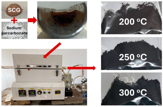 The fresh spent coffee grounds (FSCG) used in this study were collected from convenience stores. All collected FSCG were stored uniformly in a refrigerator (SAMPO, Taiwan) at 4 °C to prevent mold growth. To ensure a uniform particle size of FSCG, they were sieved through a Tyler 35-mesh sieve. The FSCG was heated in an oven (SETON, SVO-45AD, Taiwan) at 105 °C for 24 h to prepare dried spent coffee grounds (DSCG). XTSSCG was prepared by blending FSCG with an appropriate amount of sodium percarbonate (Thermo Fisher, Waltham, MA, USA, CAS: 15630-89-4) (0–1 wt%) and then torrefying the mixture under oxygen-free conditions at 200–300 °C for 30–90 min. As shown in Figure 1. Here, X in XTSSCG represents the weight percentage of the blended sodium percarbonate. For example, the treated biochar obtained by blending FSCG with 0.5 wt% sodium percarbonate and torrefying is named 0.5TSSCG. The torrefied SCGs without blended sodium percarbonate are named 0TSSCG.