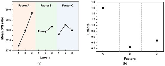 This study employs the Taguchi orthogonal experimental design to identify the most influential factors affecting the objective function and determine the optimal experimental conditions. The Taguchi method offers a robust approach for evaluating the primary effects of key parameters. By employing orthogonal arrays, it ensures that each parameter is systematically examined across its full range of values. The higher heating value (HHV) serves as the objective function, with nine experiments conducted and their specific configurations detailed in Table 2. Three factors with three levels each are employed, specifically torrefaction temperature (Factor A: 200 °C, 250 °C, 300 °C), torrefaction time (Factor B: 30 min, 60 min, 90 min), and sodium percarbonate blending ratio (Factor C: 0 wt%, 0.5 wt%, 1 wt%), all of which are presented in Table 2a. Table 2b details the results of nine Taguchi orthogonal experiments, with the Taguchi method conducting statistical evaluation via calculation of signal-to-noise (S/N) ratios for the “larger-the-better” characteristic []. Figure 5a presents the mean signal-to-noise (S/N) ratios of the three factors across their different levels. Factor A exhibits the most significant variation in mean S/N ratios across its different levels. Figure 5b indicates that torrefaction temperature (Factor A) is the most prominent factor influencing changes in HHV. Moreover, the optimal experimental parameters identified through nine Taguchi orthogonal experiments are a torrefaction temperature of 300 °C, a torrefaction time of 90 min, and a sodium percarbonate blending ratio of 0.5 wt%, which corresponds to the ninth run among the nine experiments. The highest HHV corresponding to the optimal experimental parameters is about 29.42 MJ∙kg−1.