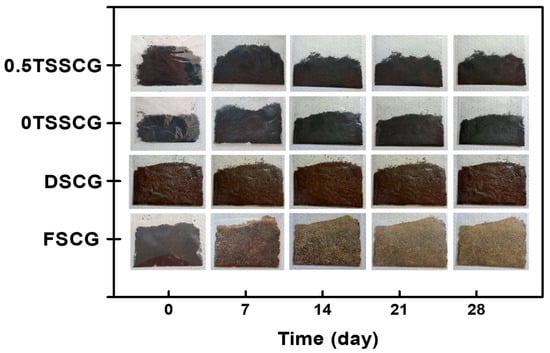 Storage stability constitutes a critical characteristic for biomass utilized as biofuels []. Biofuels with poor storage stability are prone to spoilage and mold growth, which in turn diminishes their HHV []. This study evaluates the storage stability of its solid biofuel applications through the analysis of mildew observation, water activity, moisture content, and hygroscopicity. Figure 6 presents images of mildew observation for FSCG, DSCG, 0TSSCG, and 0.5TSSCG over a 28-day period. Among them, it is observed that the surface of FSCG sample began to growth some light yellow mold from day 7, with the quantity of mold gradually increasing over time. While no mold growth is observed in the other samples throughout the 28-day period. This corresponds to the water activity results presented in Figure 7a. FSCG exhibited a water activity of approximately 0.95, while the water activity of DSCG is significantly reduced to 0.59. According to the literature, a water activity value below 0.6 indicates that microbial growth on the sample surface is inhibited []. The water activity of 0TSSCG and 0.5TSSCG is measured at 0.57 and 0.56, respectively. Figure 7b presents the moisture content of FSCG, DSCG, 0TSSCG, and 0.5TSSCG under conditions of 25–28 °C and 60–70% humidity. Moisture content generally exhibits a proportional relationship with the probability of mold growth within a specific range []. The moisture content of FSCG is approximately 70%, while that of dried SCG is reduced to about 15%. The moisture content of torrefied SCG without sodium percarbonate blending is approximately 4.5%, and that of 0.5TSSCG is slightly increased to 7.7%. Figure 8 presents the hygroscopicity of DSCG, 0TSSCG, and 0.5TSSCG under conditions of 25–28 °C and 60–70% humidity. The results indicate that DSCG exhibits the highest hygroscopicity, and its water adsorption amount stabilizes at approximately 8.5 mg at 100 min. Based on the FTIR results in Figure 3, the surface of DSCG exhibits a stronger peak corresponding to hydroxyl functional groups, which indicates that the surface of DSCG is more prone to forming hydrogen bonds with water []. This characteristic facilitates the adsorption of moisture from the air and thus results in DSCG exhibiting higher hygroscopicity than 0TSSCG and 0.5TSSCG.