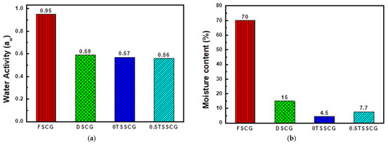 Shows the (a) water activity; and (b) moisture content of FSCG, DSCG, 0TSSCG, and 0.5TSSCG.