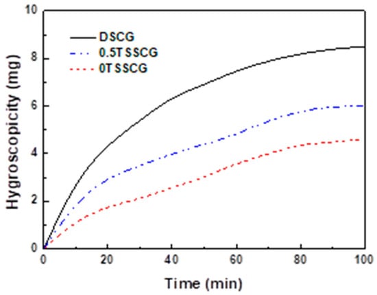 Shows the hygroscopicity of DSCG, 0TSSCG, and 0.5TSSCG.