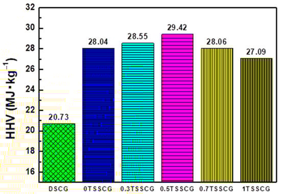Figure 4a,b show the pyrolysis TGA and DTG curves of DSCG, 0TSSCG, and 0.5TSSCG, respectively. In Figure 4b a sharp peak and a smaller shoulder peak are observed at 315 °C and 350 °C for DSCG. These peaks are from the thermal decomposition of hemicellulose and cellulose respectively []. A peak appearing at 407 °C is considered to be the thermal degradation of lignin []. For 0TSSCG and 0.5TSSCG a small shoulder peak and a prominent peak are observed at 344 °C and 405 °C. These peaks correspond to the thermal decomposition of cellulose and lignin. Disappearance of the hemicellulose peak and the increase in the lignin peak are associated with improved HHV and thermal stability of the sample [].