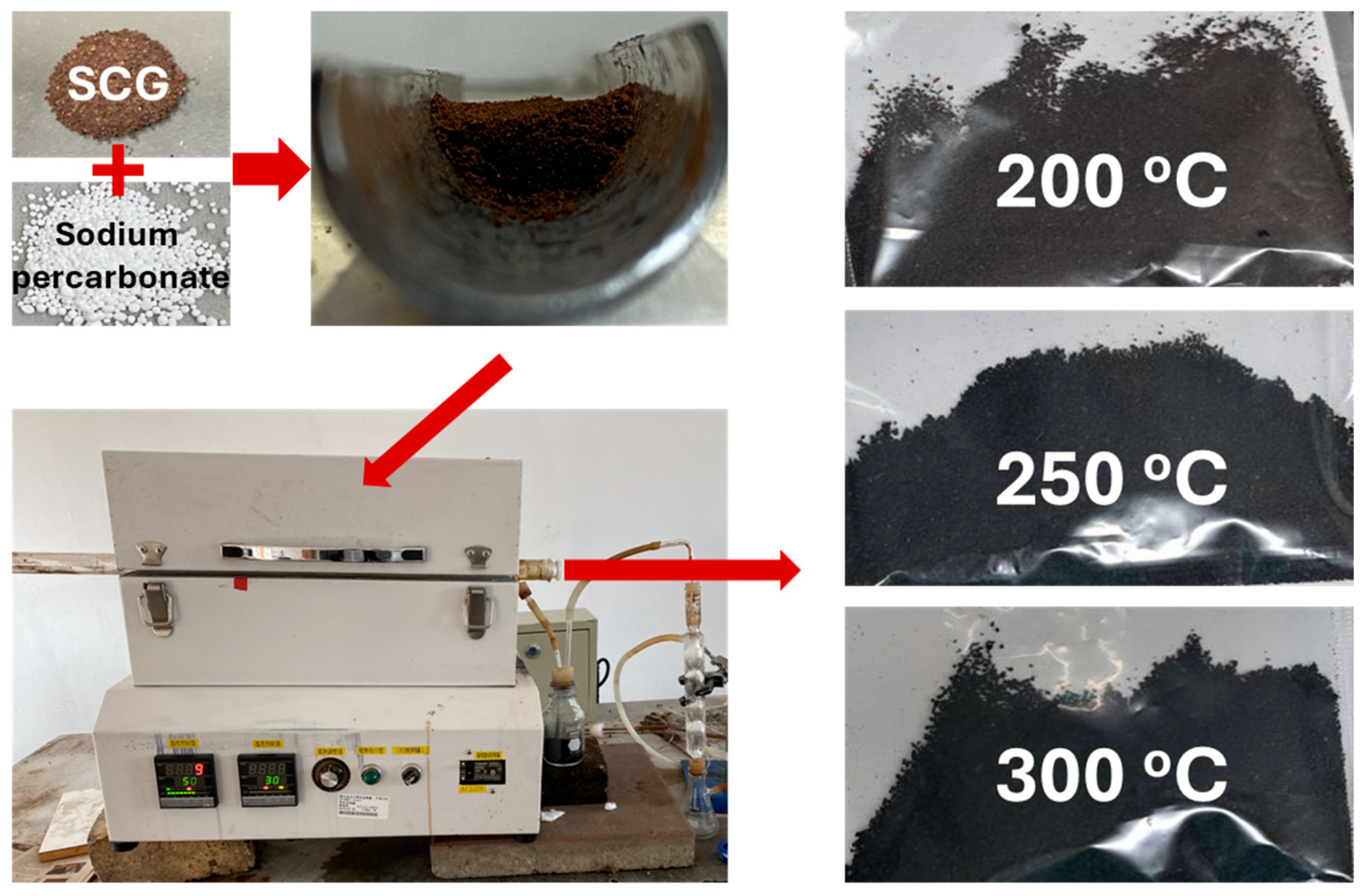 - Chen, W.-H.; Du, J.-T.; Lee, K.-T.; Ong, H.C.; Park, Y.-K.; Huang, C.-C. Pore volume upgrade of biochar from spent coffee grounds by sodium bicarbonate during torrefaction. Chemosphere 2021, 275, 129999. [Google Scholar] [CrossRef]