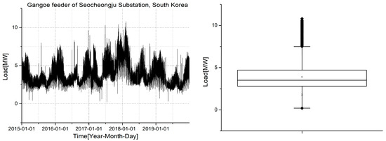 For the present work, we utilized hourly load time series data collected from the Gangoe distribution feeder connected to the Seocheongju substation in Chungcheongbuk-do, South Korea. The dataset spans a five-year period from January 2015 to December 2019. Among them, the data from 2015 to 2018 were used for model training, while the data from 2019 were reserved exclusively for evaluation and testing. The Gangoe feeder serves a mixed commercial–residential area, exhibiting diverse temporal characteristics such as intra-day variability, seasonality, weekday–weekend differences, and occasional anomalous patterns. The time series profile and statistical distribution of the data are presented in Figure 1.