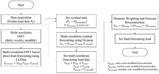 In this study, we propose a long-term load forecasting framework that combines multi-resolution Discrete Wavelet Transform (DWT), the Long- and Short-Term Time-series Network (LSTNet), and residual correction using the NLinear model. The proposed forecasting process consists of four sequential stages. In the first stage, the time series load data are decomposed into multiple scales using DWT. In the second stage, the decomposed series at each scale are independently forecasted using LSTNet to capture both short- and long-term dependencies. In the third stage, the discrepancies between the LSTNet predictions and the actual load values are treated as residual errors, which are subsequently learned and corrected by the NLinear module. In the final stage, the scale-wise forecasts are adaptively integrated into a single final forecast through a dynamic weighting mechanism. In this framework, only historical load data were used as input variables, without incorporating any exogenous features such as weather or calendar information. This design choice ensures a univariate forecasting structure that emphasizes the intrinsic temporal patterns of the load series. A schematic diagram of the proposed forecasting procedure is presented in Figure 2. The following subsections describe in detail the theoretical background, design rationale, and mathematical formulations underlying each step of the framework.
