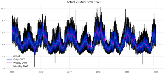 Unlike most existing DWT-based forecasting studies, which generally perform a single transformation to handle multiple frequency components collectively, this study applies DWT separately at explicit scale levels to enable scale-wise analysis grounded in physical periodicities. This approach not only enhances interpretability but also allows the distinctive load characteristics at each resolution to be more clearly represented, thereby providing an important differentiation from conventional methods. Furthermore, as noted earlier, the wavelet transformation inherently attenuates high-frequency noise, and therefore no additional preprocessing was required beyond simple linear interpolation for missing values [23].