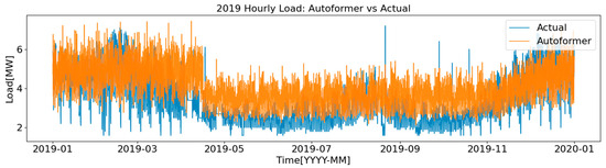 The performance comparison with these baseline models confirms the effectiveness of the proposed approach in addressing the challenges of long-term load forecasting. A summary of the quantitative results is provided in Table 1, while Figure 4, Figure 5, Figure 6 and Figure 7 illustrate the predicted and actual values for each model. The analysis demonstrates that the proposed model consistently achieves the lowest MAE and Huber loss across all evaluation metrics, with the performance gap becoming more pronounced as the forecasting horizon increases. In conclusion, the proposed Multi-resolution Residual LSTNet effectively integrates information from multiple temporal resolutions, applies residual correction and dynamic weighting, and thereby secures higher accuracy and robustness compared to existing long-term forecasting models.