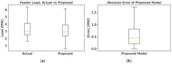 Boxplot comparison and error analysis: (a) actual vs. predicted feeder load distributions; (b) absolute error distribution of the proposed model.