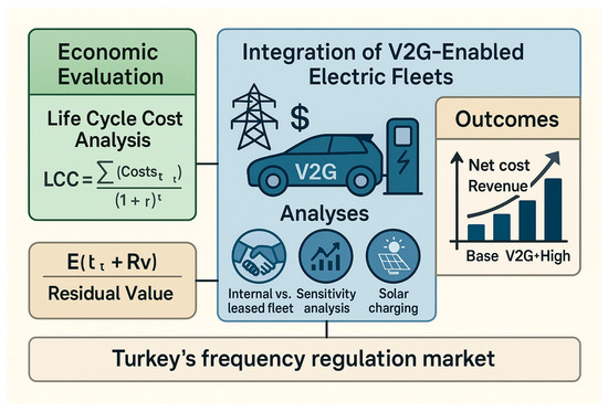 The purpose of this study is to assess the viability of a V2G-enabled cities’ electric vehicle fleet participating in Turkey’s mFRR market. Through an LCC–based approach, the study aims to explore how such systems could contribute to grid flexibility while generating financial returns for local stakeholders such as municipalities or housing cooperatives. Specific objectives include: