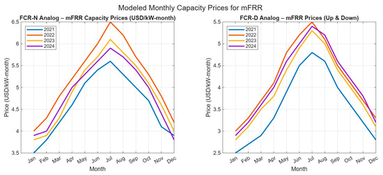Figure 3 presents monthly modeled capacity prices for mFRR in Turkey, with the left panel reflecting standby-type remuneration (similar to Sweden’s FCR-N), and the right panel capturing performance-based income patterns (analogous to FCR-D up/down services). Based on these values,
