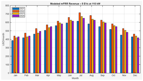 Figure 4 estimates the corresponding monthly revenues for a V2G-enabled EV fleet participating in mFRR with an aggregated capacity of 110 kW (five vehicles at 22 kW each).