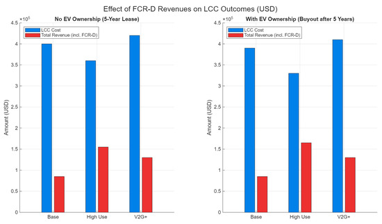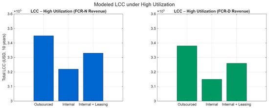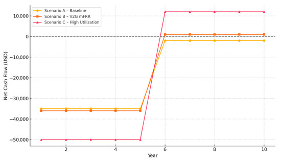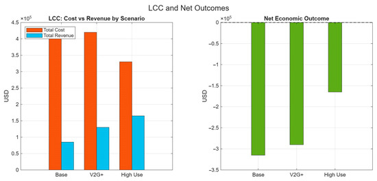 Table 11, the High Utilization scenario—featuring EV ownership combined with V2G market participation and enhanced rental activity—yields the most favorable economic outcomes. It achieves the lowest total LCC and highest net annual income, making it the only scenario to approach financial break-even within the 10-year project horizon.