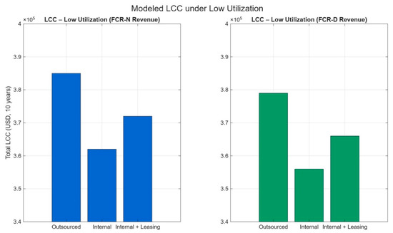 Figure 7 demonstrates the adverse effect of reduced rental utilization on LCC across all scenarios. Even with participation in high-value FCR-D markets, low fleet utilization significantly worsens financial outcomes.