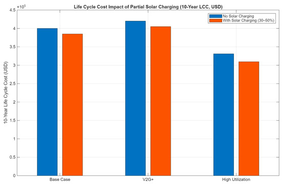 Figure 10 demonstrates the LCC savings achieved by supplementing grid charging with 30–50% solar energy. This hybrid approach reduces total LCC by up to USD 21,500 over the 10-year project period, underscoring the potential synergy between V2G and rooftop PV generation.