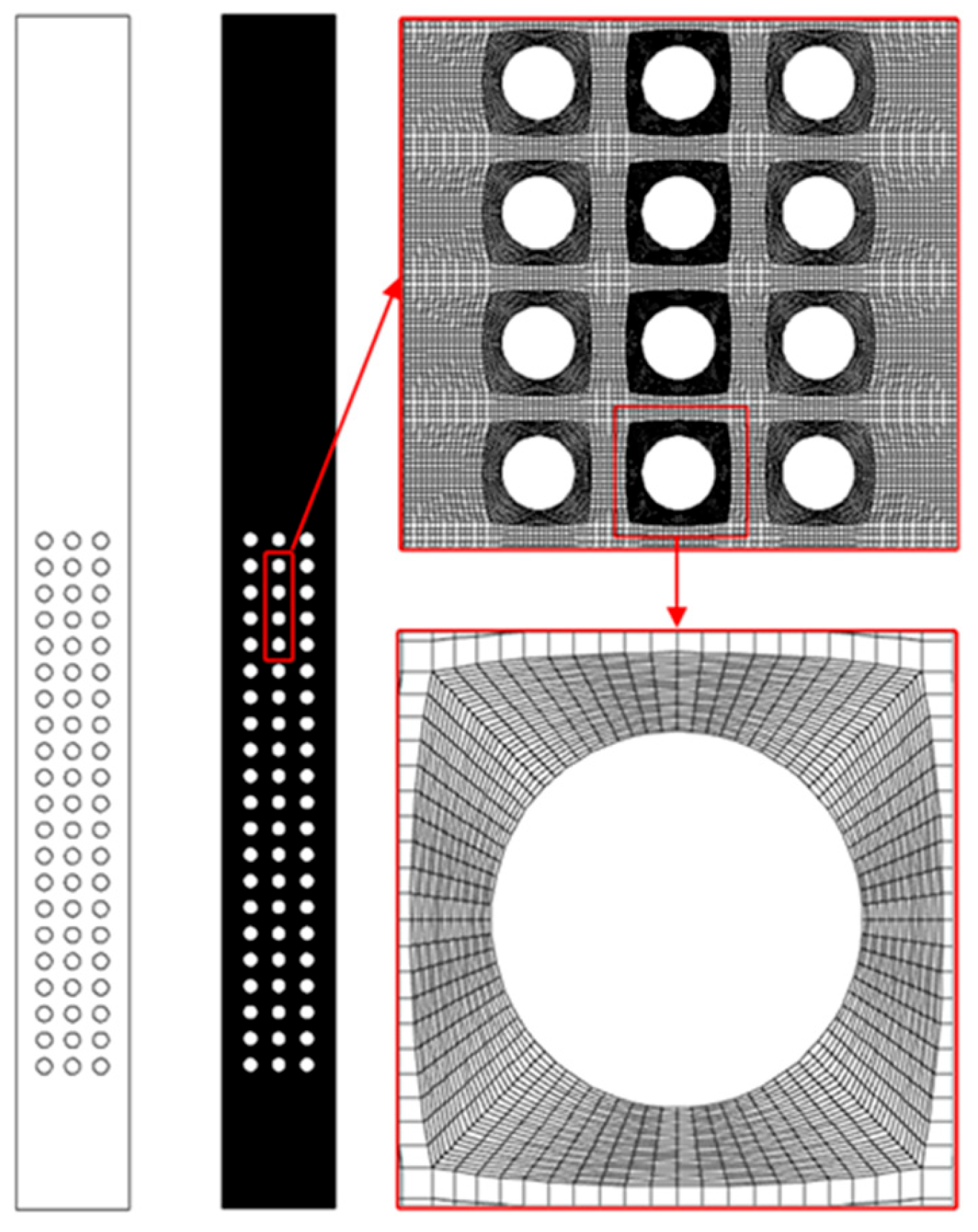 The computational domain mesh model is constructed using ICEM. The mesh area is divided into two parts: the tube bundle region and the non-tube bundle region. In the tube bundle region, an O-grid is employed for construction, and the mesh near the heat exchange tube walls is refined. The tube wall boundary is divided into 60 nodes, with the smallest mesh size being 2 × 10−5 m. The mesh size increases with distance from the tubes. In the non-tube bundle region, a structured mesh is used, with the maximum mesh size being 0.005 m.