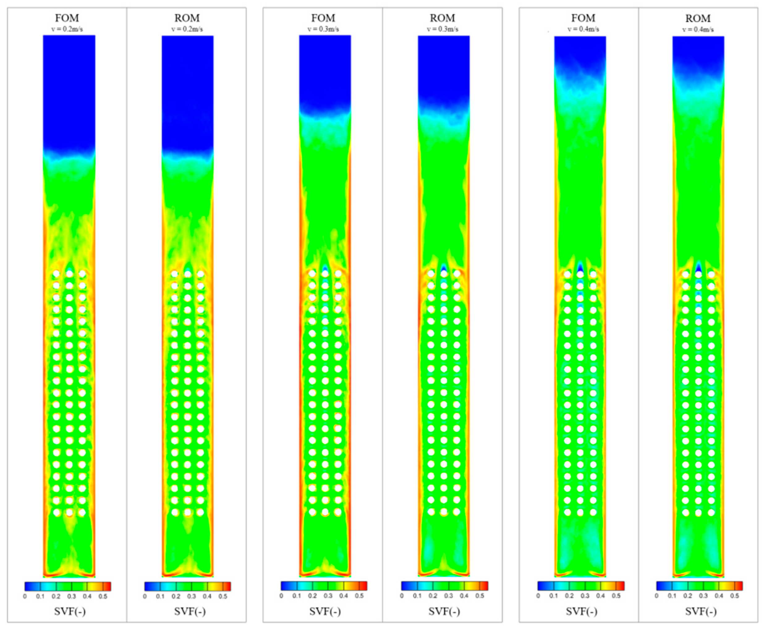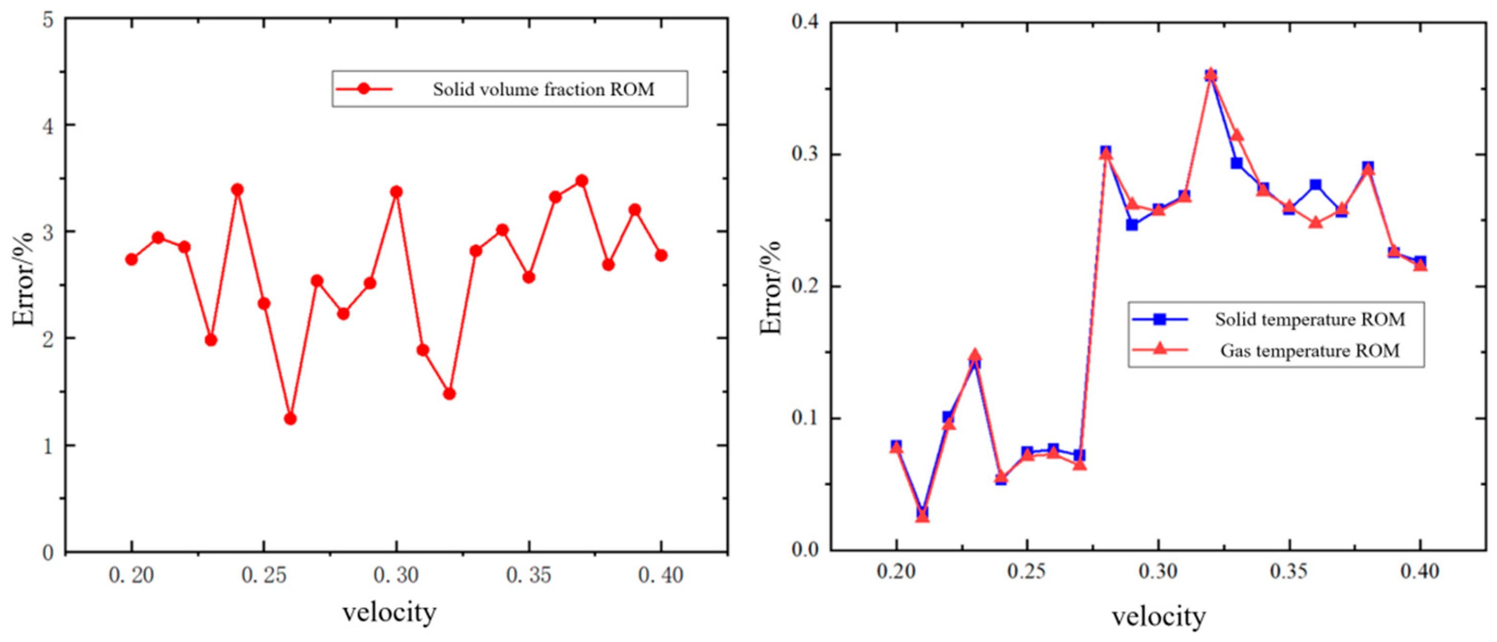 Figure 8 shows the overall computational errors of the three reduced-order models at different fluidization air velocities. Since the reduced-order model is data-driven, the error is the average error over all the data. The error distribution of the solid-phase volume fraction reduced-order model is relatively uniform across various air velocities, with computational errors within 3.5%. For the reduced-order models of both the solid- and gas-phase volume fractions, the computational errors were within 0.2% at low air velocities and within 0.4% at high air velocities.