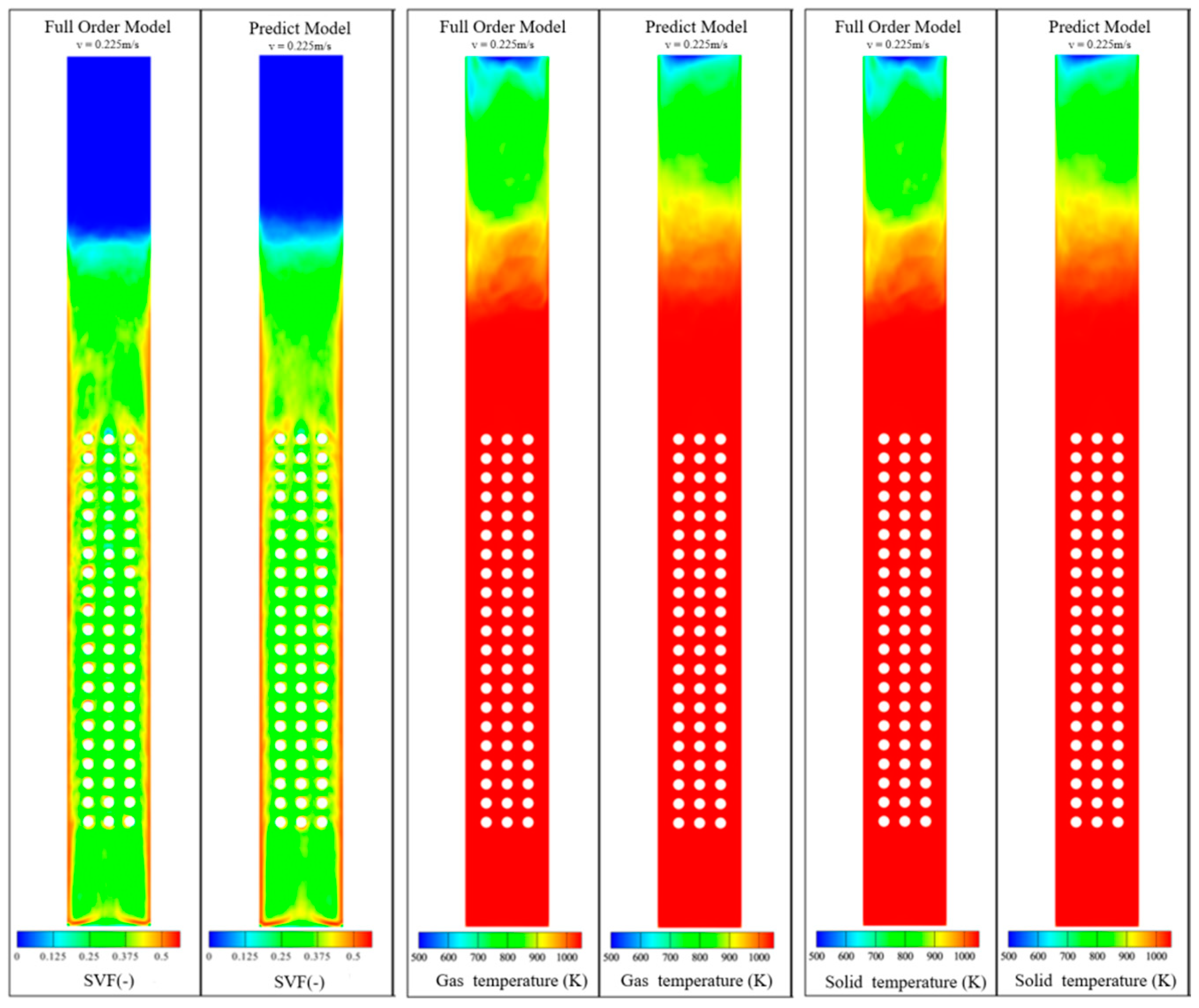 Figure 10, it can be observed that the errors of the POD-SVM prediction model are mainly concentrated in the upper half of the bed. This was because the prediction model was constructed based on the modes of the reduced-order model, which included modes from different operating conditions. In the upper part of the temperature field, where the gas phase dominated, the temperature differences between the modes of the reduced-order model were significant, leading to a reduction in the computational accuracy of the reduced-order model. The prediction model could predict the main flow characteristics of the corresponding operating conditions; however, its accuracy was limited to regions with rapid parameter changes. For operating conditions with an inlet fluidization velocity of 0.225 m/s, the overall computational accuracies of the solid volume fraction, solid temperature field, and gas temperature field prediction models were 2.89%, 1.04%, and 1.03%, respectively. For operating conditions with an inlet velocity of 0.325 m/s, the overall computational accuracies were 2.99%, 1.08%, and 1.09%.