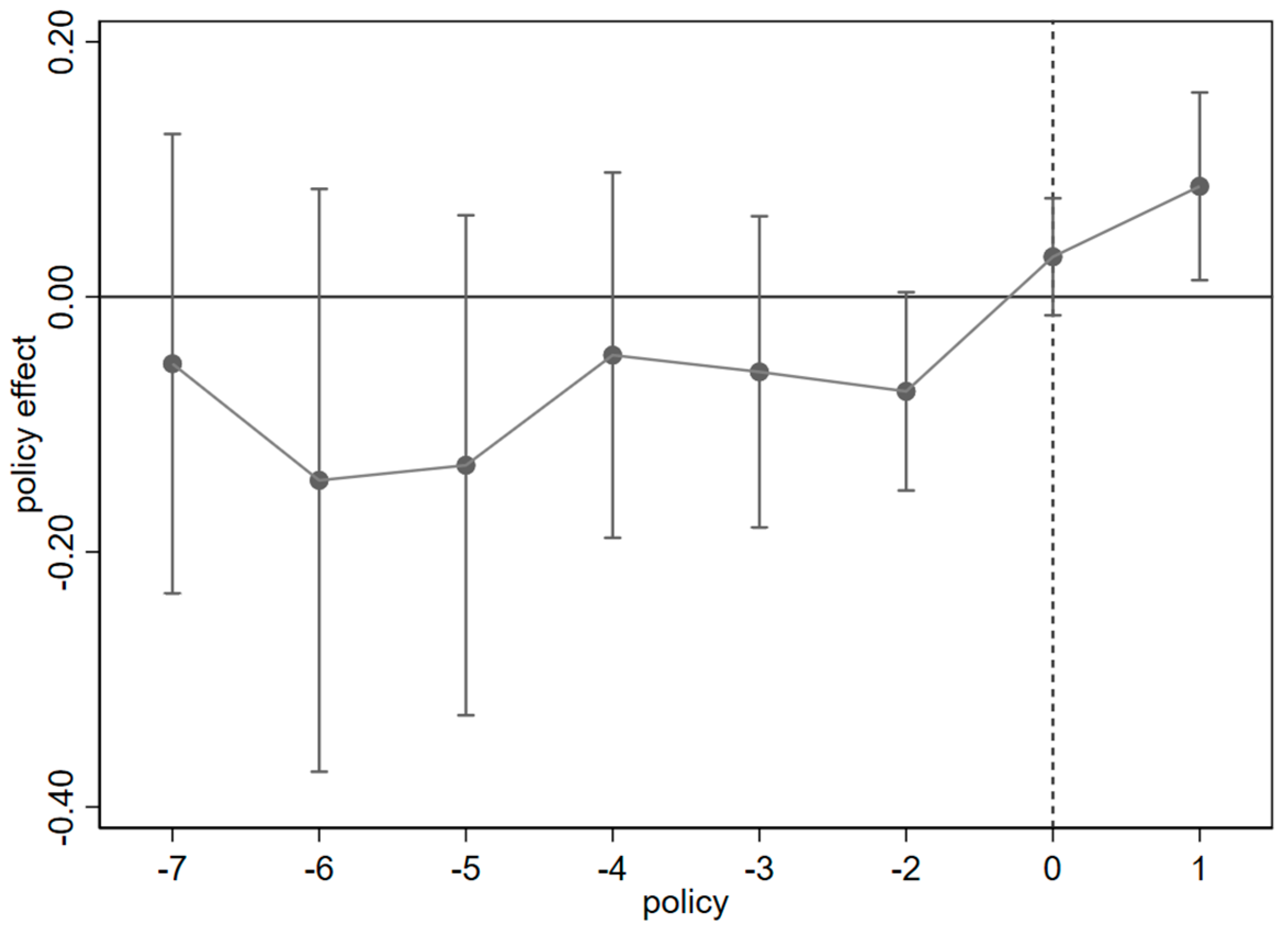 Figure 1. It can be observed that prior to the service trade pilot city policy, policy impacts on renewable energy transition failed to pass the significance test. Although the policy began to show effects in the same year of implementation (the second part of the year from August, when the State Council’s approval was issued), some confidence intervals remained close to the zero line. One year after the policy was implemented, it had significantly increased the region’s renewable energy usage, meeting the parallel trend test criteria.