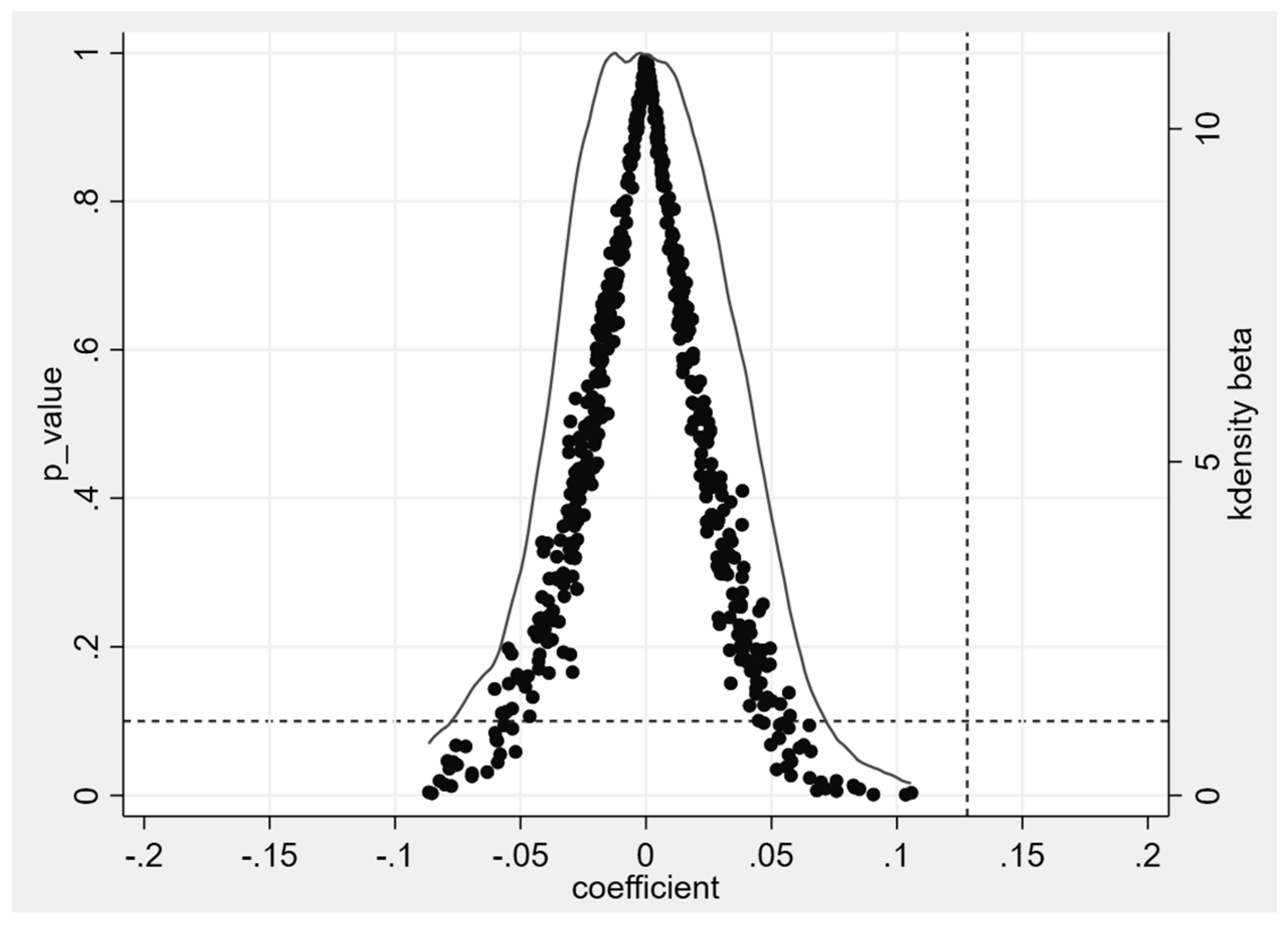 p-value distribution exhibits normal characteristics, and the regression coefficient with kernel density is concentrated near zero. A substantial majority of simulated regression coefficients are significantly lower than the actual policy shock of 0.128; therefore, the DID policy effect observed in this study is not incidental and not influenced by other policies or confounding factors, as supported by the placebo test results.