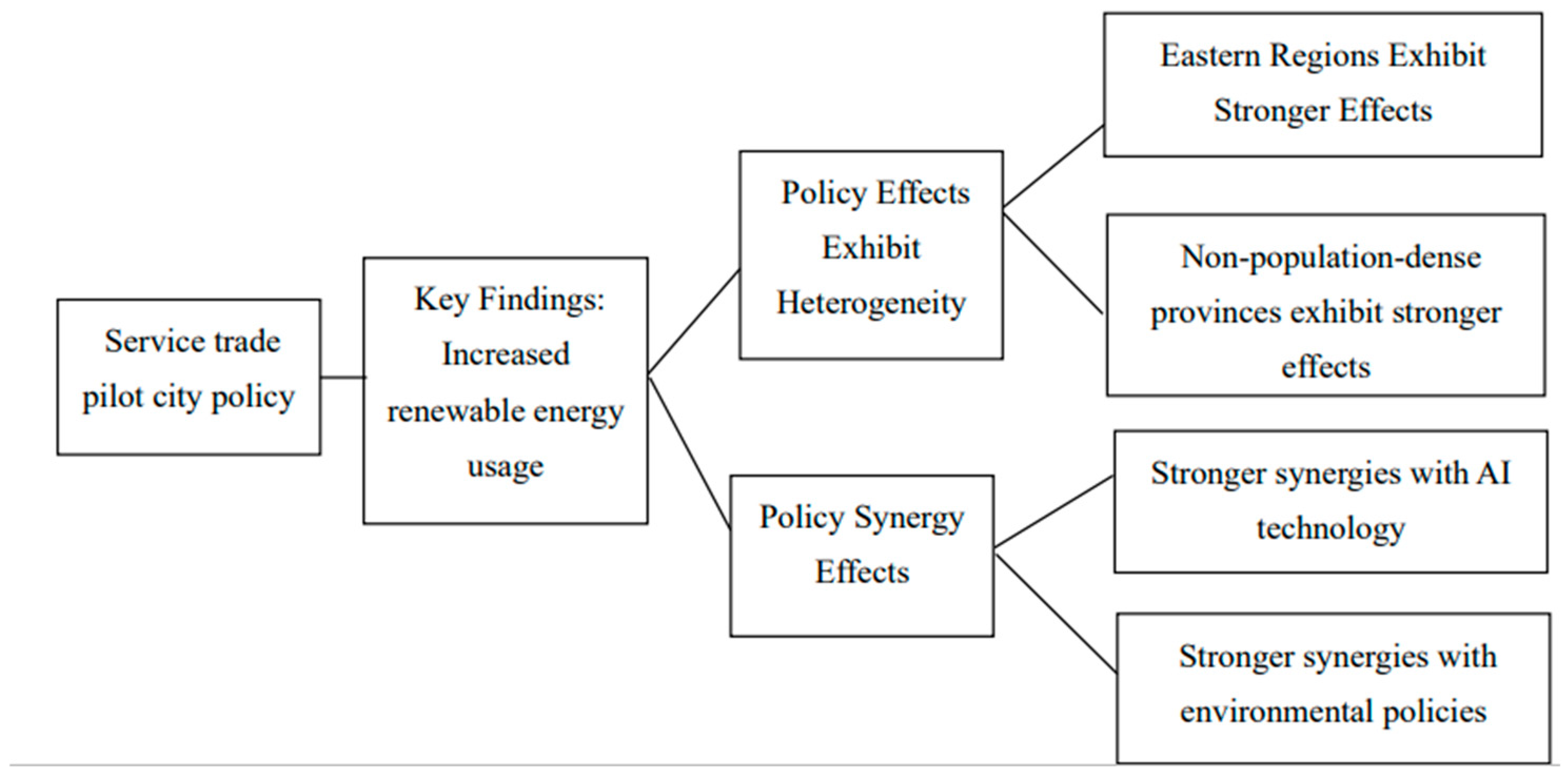 This paper analyzes the impact of China’s service trade pilot city policy on urban energy transition from the perspectives of knowledge capital agglomeration, networked division of labor systems, and value empowerment. These policies are treated as a quasi-natural experiment utilizing city-level data. While accounting for city-level external factors, the study examines the effects of both individual policies and their “combination” on local energy structure transformation. For pilot cities, these policies significantly promoted regional energy structure upgrades by removing service trade barriers and facilitating cross-regional and transnational knowledge capital flows. This effect was more pronounced in Eastern China and non-populous provinces, correlating with local policy support, infrastructure, global value chain integration, traditional industry share, and regional economic development, The schematic diagram of the basic research conclusions is shown in