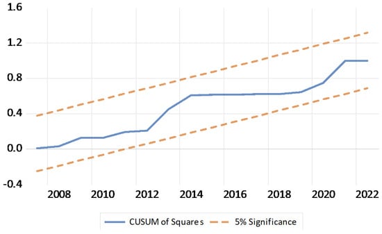 From the above diagram, we observe that the CUSUMSQ curve remains within the confidence limits. Therefore, we can say that there are no serious changes in the error variance. Therefore, the NARDL(2,0,1,0,2) model is reliable. This robustness check further highlights that the observed asymmetry is not a byproduct of the chosen lag specification and that the estimated parameters are stable over time, thereby strengthening the validity of the empirical results.