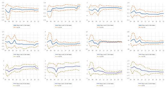 From Figure 6, we observe that positive shocks from renewable energy sources seem to have a greater impact on economic growth than negative shocks. The difference in impacts seems to be at its maximum in the third year after its occurrence, according to the data in the figure. As shown in Figure 6, the asymmetric impact of renewable energy sources on economic growth is significant in the long run, because the red line marked with “asymmetry” (which shows the impact regardless of whether the change is positive or negative) differs significantly from 0 over the entire period considered. Therefore, we can say that positive changes in renewable energy sources act as a lever for growth (investments, technology, jobs, and environmental benefits). Therefore, their impact is disproportionately greater. Negative changes in renewable energy sources do not have a correspondingly large negative impact because of the following: