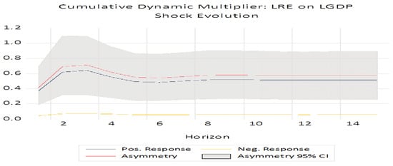The NARDL model uses Cumulative Dynamic Multipliers (CDMs) to assess the impact of asymmetric changes in the explanatory variables on the dependent variable over time. These multipliers can be positive or negative, reflecting asymmetric effects. The results of the NARDL model confirm the existence of an asymmetric co-integration relationship of renewable energy sources to economic growth. Therefore, cumulative potential multipliers can be used to illustrate the asymmetric responses of renewable energy sources to a change in economic growth. Figure 6 shows the responses of economic growth to changes in renewable energy sources (long-term asymmetry and short-term symmetry).
